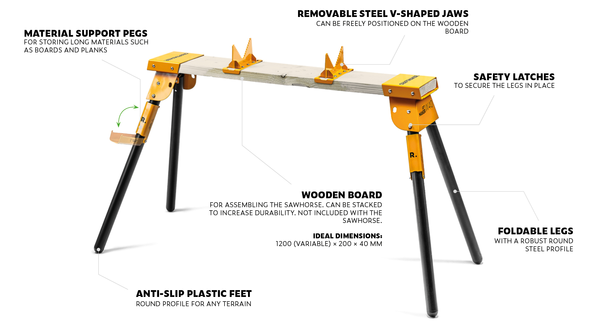 CRAFTMAKER Cut Maker W40 is a robust steel sawhorse built for more than just wood cutting – all in CRAFTMAKER’s signature black and yellow style. Enjoy the flexibility to swap out the supporting plank, or adjust the spacing of the steel jaws, which can be moved easily thanks to their bolt-on design. Flip-out yellow material supports add even more convenience. Remove the steel jaws from the wooden base to turn the W40 into a temporary workbench or support stand of any length. Quick and easy to set up or fold down. A stable cutting horse, ideal for both professionals and DIYers.