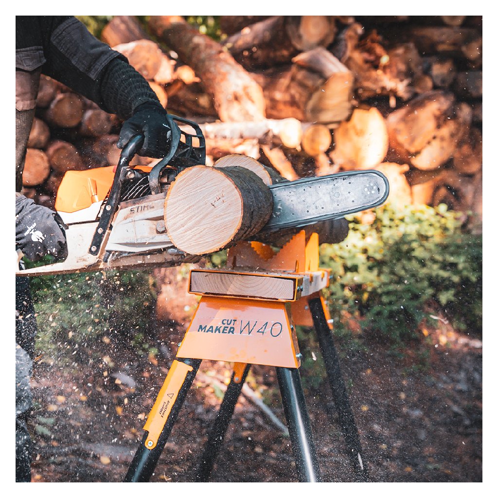 CRAFTMAKER Cut Maker W40 is a robust steel sawhorse built for more than just wood cutting – all in CRAFTMAKER’s signature black and yellow style. Enjoy the flexibility to swap out the supporting plank, or adjust the spacing of the steel jaws, which can be moved easily thanks to their bolt-on design. Flip-out yellow material supports add even more convenience. Remove the steel jaws from the wooden base to turn the W40 into a temporary workbench or support stand of any length. Quick and easy to set up or fold down. A stable cutting horse, ideal for both professionals and DIYers.