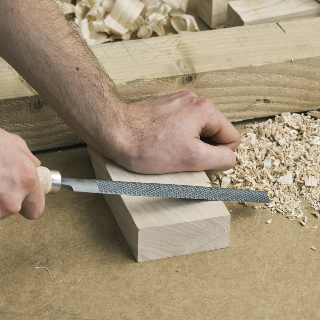 Japanese double-sided file with double coarseness and double profile. The flat side of the file has finer teeth. The half-round side of the file has coarser teeth. Traditional wooden handle with metal ferrule. File length 330 mm. Intended for working with wood.