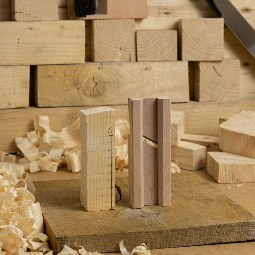 Japanese plane for chamfering plasterboard edges. The blade can be easily adjusted and secured with screws. The thickness of the shaving and the smoothness of the surface depend on the personal setting of the iron. Ideally, the blade should protrude 0.05 to 0.2 mm from the body of the plane. Like Japanese saws, Japanese planes are traditionally used by pulling towards oneself. One hand should guide the plane while the other gently pushes the plane towards the material.