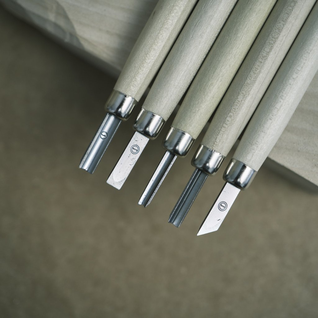 A set of Japanese miniature carving chisels from the MARUICHI brand with varying widths and beveled, straight, U, and V blade profiles. Classic wooden handle. 5 pieces in a package. Ideal for modelers and detailed carving work.