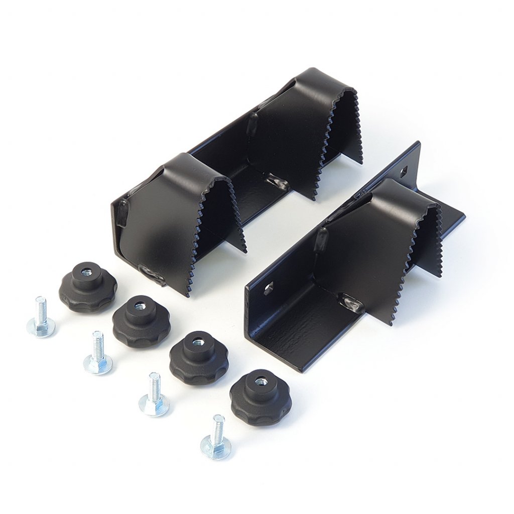Set of toothed attachments for bench vise. Because the original vise jaw lining is made of solid rubber, it may not meet the fastening needs for all types of material. These steel jaws ensure a firm and secure grip when cutting, for example, wood or steel profiles, beams, pipes and more. The set includes nuts with ergonomic heads for quick assembly.