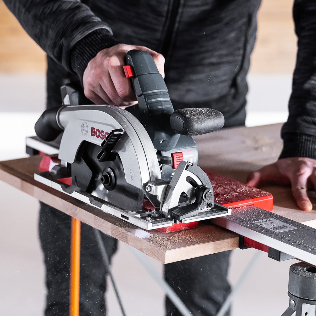 Using the saw guide and guiding adapter is more or less easy. Attach the circular saw using screws on the sliding adapter and tighten the screws firmly. On the underside, there is an adjustable pressure strip, which needs to be set for smooth operation so that the entire adapter fits correctly on the saw guide. Thanks to this component, the adapter is also compatible with saw guides from other brands. The only limitation is the maximum clamping width - 82 mm.