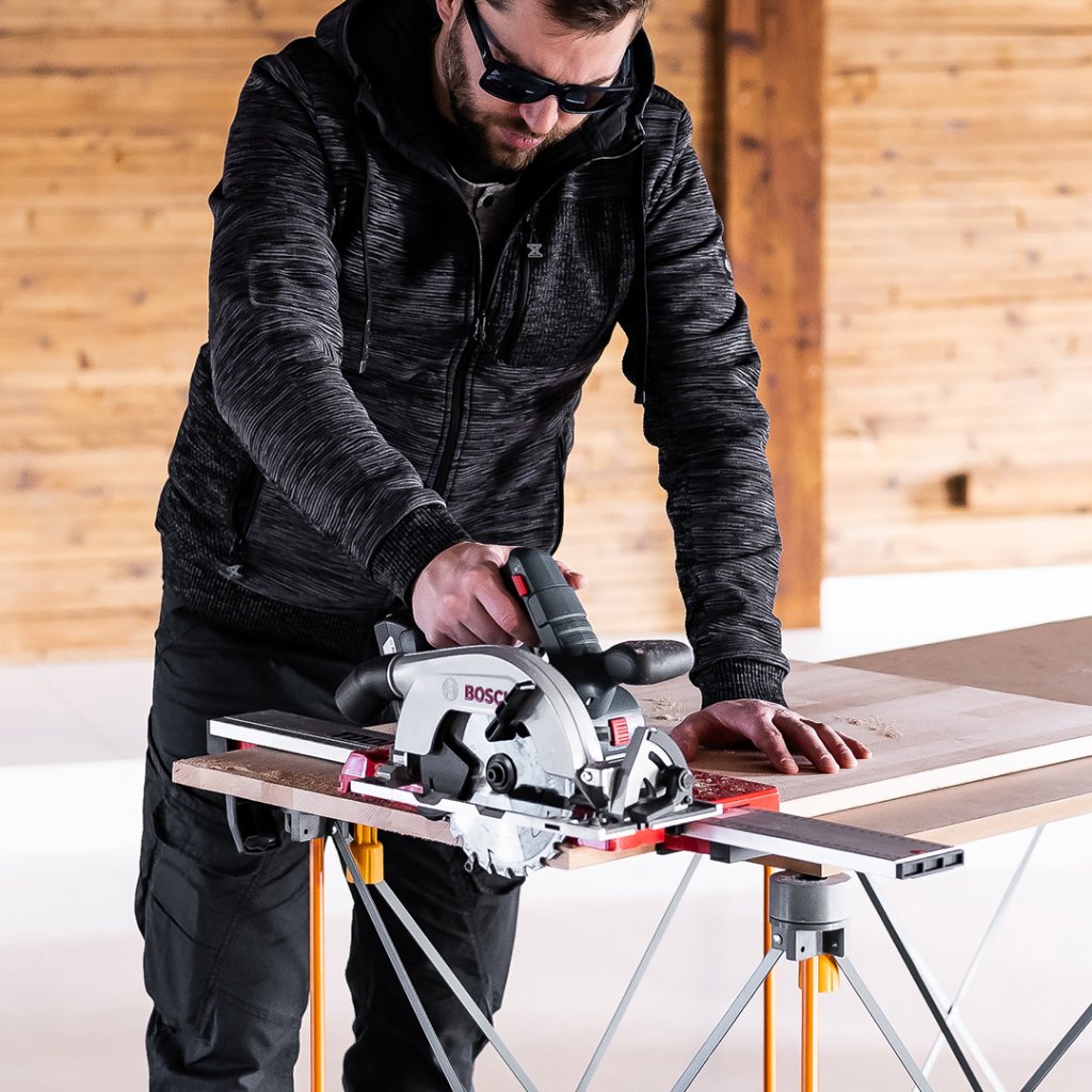 The saw guide facilitates straight and precise cuts when cutting wooden surfaces or narrow sheet metal materials. Just adjust the sliding stop to the desired length and secure it in place. A saw guide is the easiest way to make straight and precise cuts. It is suitable for DIY enthusiasts and professionals. The product features a metric scale.